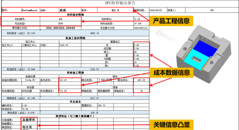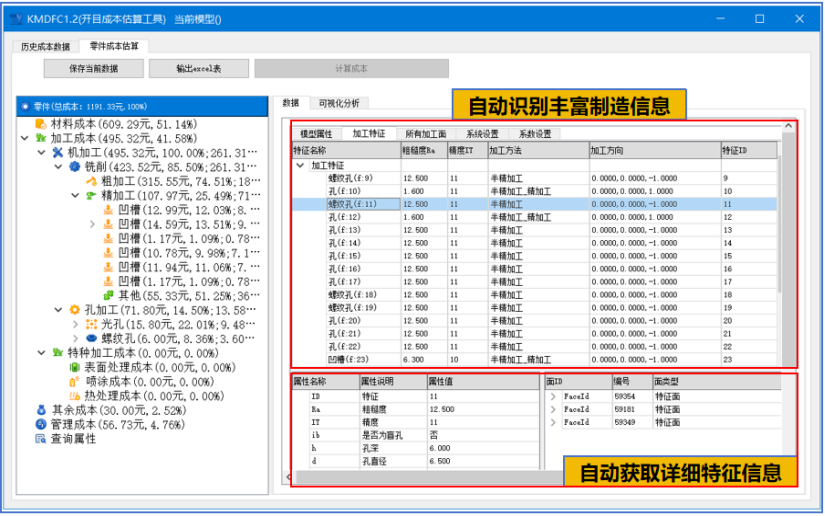 開(kāi)目3DDFC 是一款基于 MBD 模型和工藝知識(shí)庫(kù)的專(zhuān)業(yè)三維制造成本分析與估算軟件,在不依賴(lài)詳細(xì)工藝路線的情況下,根據(jù)零件幾何信息和精度信息一鍵式完成成本估算。該軟件充分融入“并行工程”的關(guān)鍵思想,并基于開(kāi)目的三維設(shè)計(jì)模型特征識(shí)別技術(shù),以及零件加工成本計(jì)算模型,能快速獲得相對(duì)準(zhǔn)確的加工成本。為面向成本的設(shè)計(jì)優(yōu)化提供參考指引,也為企業(yè)對(duì)外產(chǎn)品報(bào)價(jià)或產(chǎn)品外協(xié)件采購(gòu)價(jià)格提供量化依據(jù),實(shí)現(xiàn)降本增效。