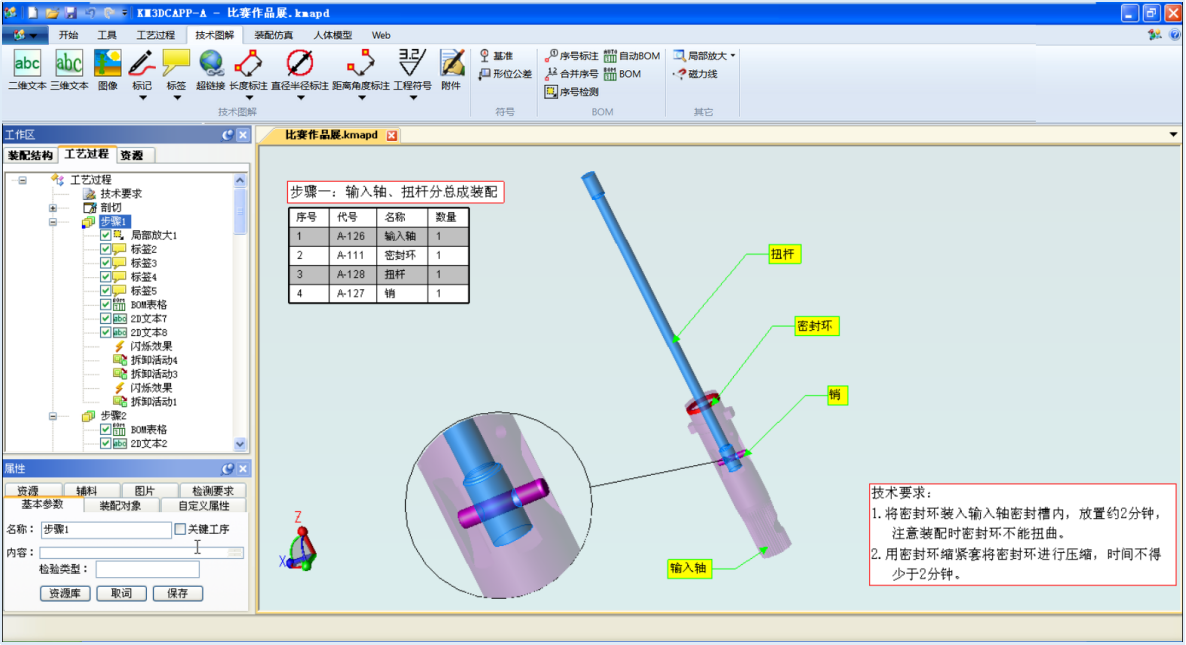 通過(guò)詳細(xì)工序設(shè)計(jì)功能模塊,能夠規(guī)劃裝配的每一道裝配工序或檢測(cè)工序,指定每一道工序裝配的零部件清單,定義工序的各個(gè)工步。在拆卸產(chǎn)品的過(guò)程中,可以使用如扳手、螺絲刀等工藝裝備,并定義使用工藝裝備拆卸產(chǎn)品零部件的詳細(xì)細(xì)節(jié)。通過(guò)技術(shù)圖解,用戶可以指定工序的工序名稱、內(nèi)容,通過(guò)自定義屬性定義裝配的各種信息,包括裝配方法、注意事項(xiàng)、檢驗(yàn)方法等等,產(chǎn)生完善的裝配數(shù)據(jù)信息。