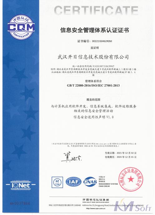 近日,開目公司在各部門的積極配合與共同努力下,從自主研發(fā)的應(yīng)用軟件、信息系統(tǒng)集成、軟件運維服務(wù)等核心業(yè)務(wù)版塊深度開展了信息安全管理活動,并經(jīng)認證中心專家組全面、嚴格、專業(yè)的審核,開目公司順利通過了ISO27001信息安全管理體系認證審核,獲得了認證證書。