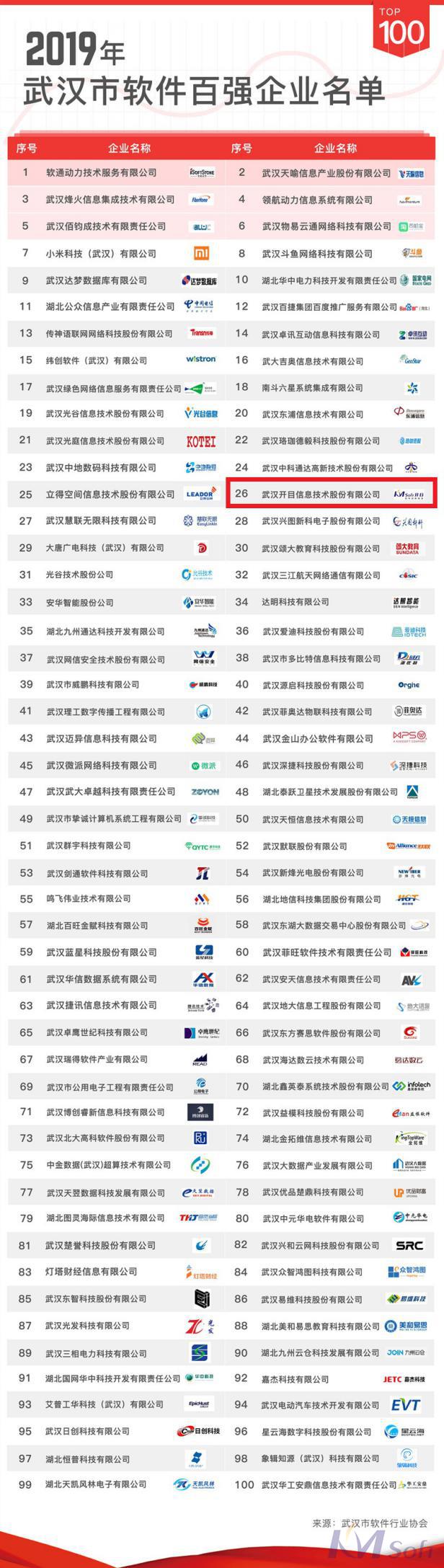 7月31日,武漢市經(jīng)濟和信息化局、武漢市軟件行業(yè)協(xié)會發(fā)布了“2019年武漢市軟件百強企業(yè)發(fā)布會”,武漢開目信息技術(shù)股份有限公司光榮入選本次百強榜單。