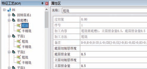 針對(duì)機(jī)匣類型零件,定義一套加工知識(shí)庫(kù),基于識(shí)別的特征的幾何信息與制造信息進(jìn)行加工方法推理,推理出特征的加工步驟以及余量。如機(jī)匣中的錐底槽特征經(jīng)過知識(shí)庫(kù)的推理得出的加工步驟為“粗銑—半精銑”,且粗銑的底面與立面的余量為0.5 mm,如圖4所示。