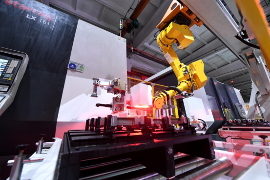 哈電集團(tuán)集成工業(yè)機(jī)器人正在機(jī)器視覺(jué)引導(dǎo)下進(jìn)行上下料作業(yè)。