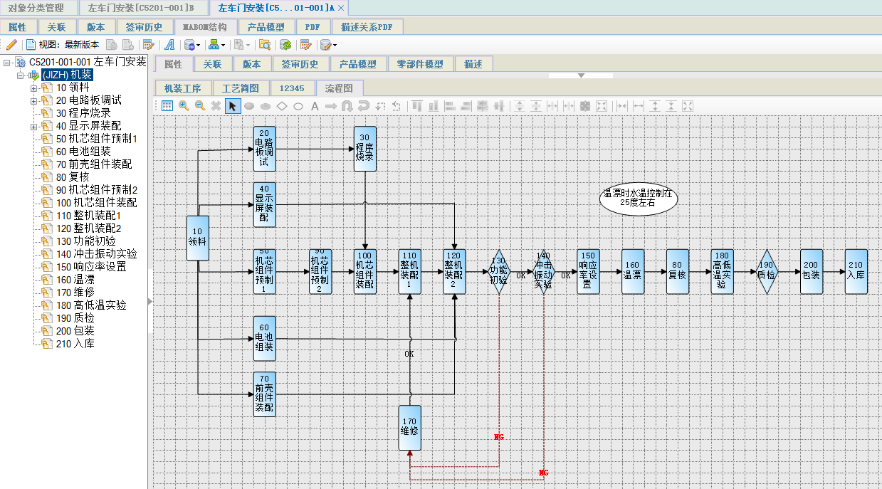 通過(guò)在工序流程圖中增加回轉(zhuǎn)線、標(biāo)注圖形、判定等圖形,能清晰和直觀的表達(dá)工序間的流轉(zhuǎn)。開(kāi)目eCOL PLM 8.0新版本支持電裝、機(jī)裝、裝調(diào)等多專業(yè)的協(xié)同工作,支持自定義串行或并行的裝配過(guò)程,以及自動(dòng)生成和輸出工序流程圖,用于生產(chǎn)車間的工作指導(dǎo)或展示等;支持在任意地方添加批注,醒目且直觀地體現(xiàn)工序流程圖的需注意事項(xiàng);支持回退線用于滿足裝調(diào)等專業(yè)的調(diào)試需求,清晰地表達(dá)調(diào)試工藝過(guò)程中根據(jù)檢測(cè)結(jié)果來(lái)決定工序走向的情況。