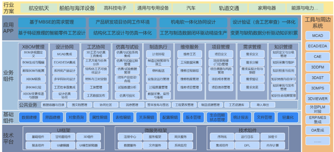 基于這些“核”動(dòng)力,KMPLM CLOUD可建構(gòu)數(shù)字化研發(fā)、數(shù)字化工藝、數(shù)字化制造等應(yīng)用場景的典型應(yīng)用APP,包括基于MBSE的需求管理、產(chǎn)品研發(fā)項(xiàng)目協(xié)同工作環(huán)境、機(jī)電軟一體化協(xié)同設(shè)計(jì)、設(shè)計(jì)驗(yàn)證(含工藝審查)一體化、基于特征推理的智能零件工藝設(shè)計(jì)、結(jié)構(gòu)化工藝設(shè)計(jì)與仿真一體化、工藝與制造數(shù)據(jù)閉環(huán)驅(qū)動(dòng)精益生產(chǎn)、變更與缺陷數(shù)據(jù)分析驅(qū)動(dòng)知識(shí)積累等。